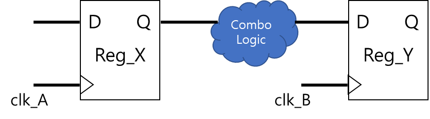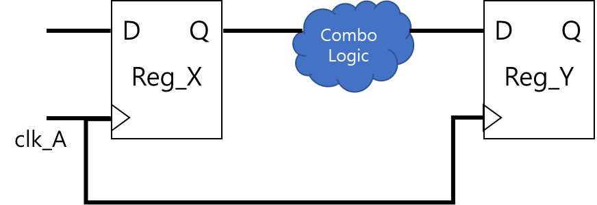 일반적으로 디지털 설계에서는 동일한 Clock Domain 내에서 로직을 구성한다. 아래 그림처럼 두 개의 레지스터(Reg_X, Reg_Y)에는 동일한 Clock(clk_A)으로 동기화되어 있으며, 그 사이에 존재하는 로직은 동일한 Clock으로 1-Cycle 안에 처리 될 수 있도록 설계한다. 동일 Clock Domain으로 구성되어 있으므로, clk_A의 clock period와 Reg_X의 Clock to Q delay와 Combo Logic의 Delay와 Reg_Y의 Setup/Hold를 계산하여 타이밍을 맞출 수 있다.
