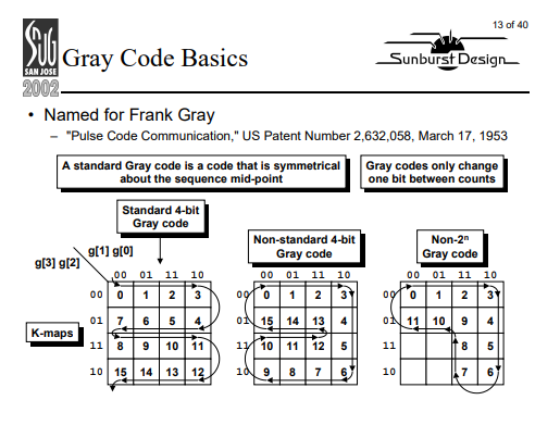 4-bit의 값이 변경될 때 1-bit만 변경되도록 순서를 배치할 수 있다. 이렇게 되면 Clock domain을 넘어가는 값이 가질 수 있는 경우의 수는 2가지이다. 이전 값 혹은 다음 값이다. 예를 들면 0011 -> 0010으로 변경되면, 가질 수 있는 값은