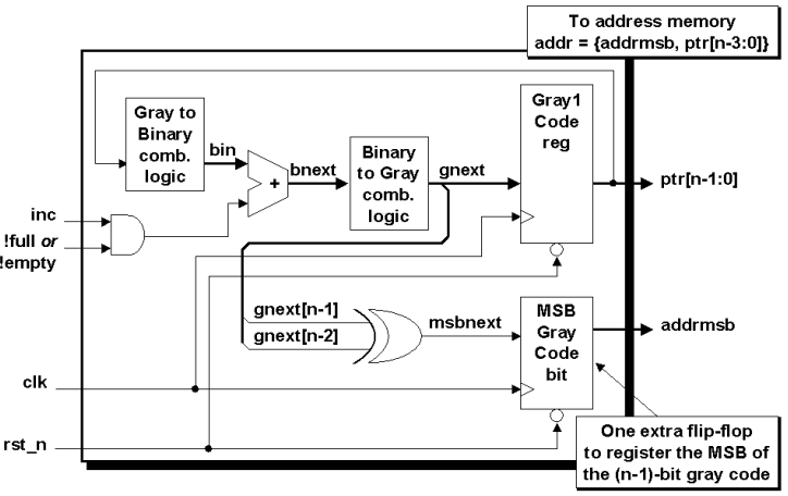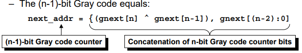 정리하자면 Clock Domain을 넘어가는 Code는 N-bit Gray Code이지만, 하위 (N-1)-bit을 그대로 address로 사용하지 않고, 위와 같은 수식을 통해서 (N-1)-bit Gray code Counter로 변환하여 사용한다.