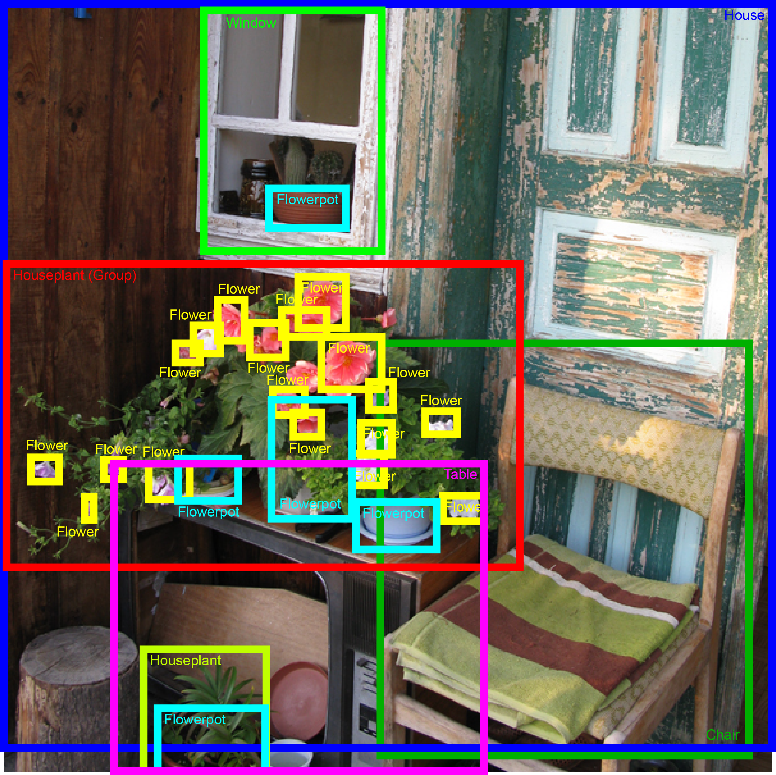 위의 사진은 매우 간단한 예제였고, 아래와 같은 사진에서도 Object detection을 수행할 수 있어야 한다. 사진 한 장에 다양한 크기의 box와 label이 존재한다. class도 window, flower, houseplant 등 다양하며 box 안에도 다른 box가 존재하기도 한다. 이렇게 multi-class object 와 다양한 size의 object도 검출 가능해야 한다.