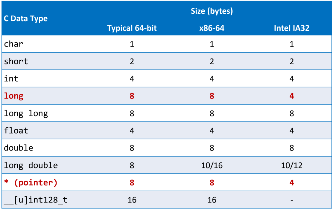 Memory로부터 데이터를 가져올 때의 주소와 크기에 대해서 알아보았다. 다음은 데이터 타입에 대해서 알아보자. 각 데이터는 타입에 따라 크기가 결정된다. 아래와 같이 C Standard로 사용되는 data type의 크기를 나타내었다. 각 크기는 Byte단위이며, Machine의 type에 따라 크기가 달라지는 부분도 있다.