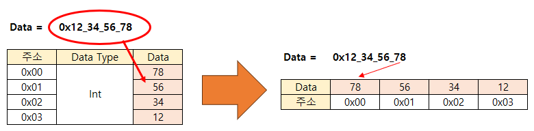변수의 주소는 주로 하위 크기 단위의 주소로 표현하고, 그렇기 때문에 하위 주소에 해당하는 데이터를 가져올 때, 편리하다. 예를 들어 예제에서 하위 0x78를 가져오려면 빅 엔디언에서는 data의 주소 값(0x00)에 0x03을 더해서 접근해야하지만, 리틀 엔디언에서는 data의 주소 값(0x00)에서 바로 접근 가능하다.