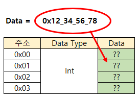 예를 들어 아래와 같이 int type Data가 선언되었고, 주소는 0x00부터 저장된다고 가정하자. 그러면 각 주소 0x00, 0x01, 0x02, 0x03에는 어떻게 저장해야 할까?