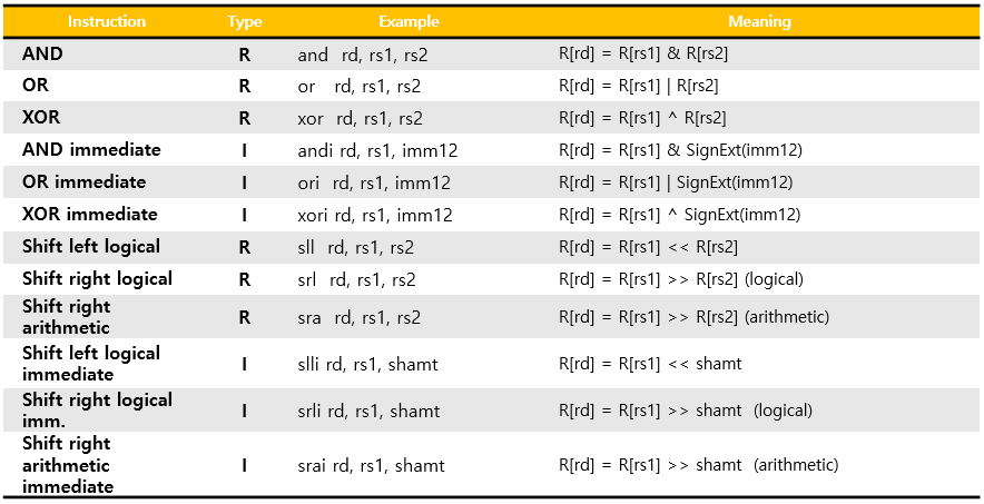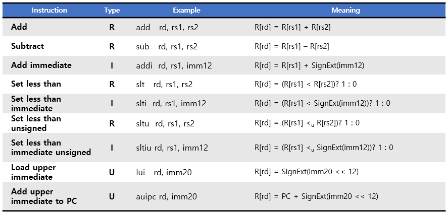 RISC-V에서는 Arithmetic/Logical Operation을 지원하는 Instruction이 존재한다.