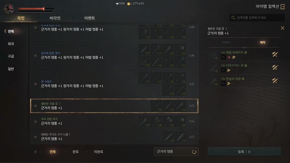 컬렉션 리스트를 보면 알겠지만, 그냥 아이템보다는 강화된 아이템들이 많다. 실패 확률이 존재하는 +7 이상의 높은 등급의 아이템들이 많기 때문에, 쉽게 도전할 수 없다.