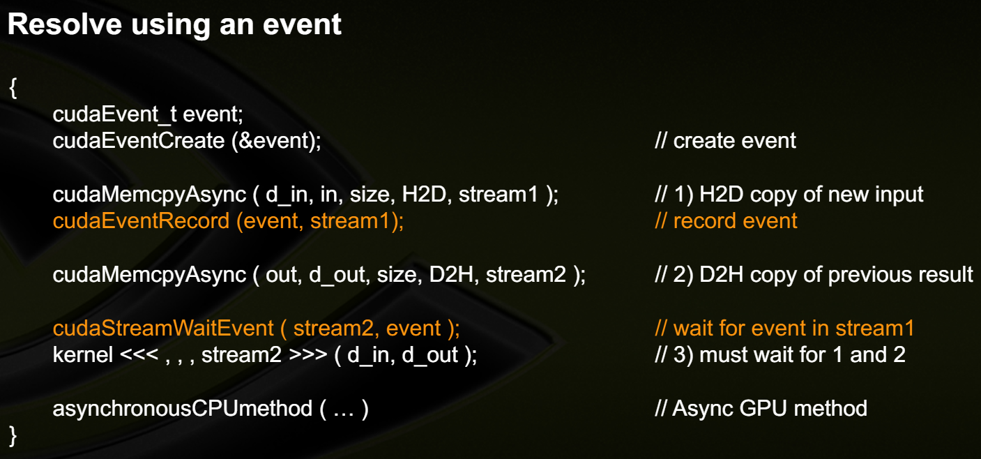 3. Synchronize using Events :: 'cudaEventRecodd(event, streamid)', 'cudaEventSynchronize(event)', cudaStreamWaitEvent(stream, event)', 'cudaEventQuery(event)