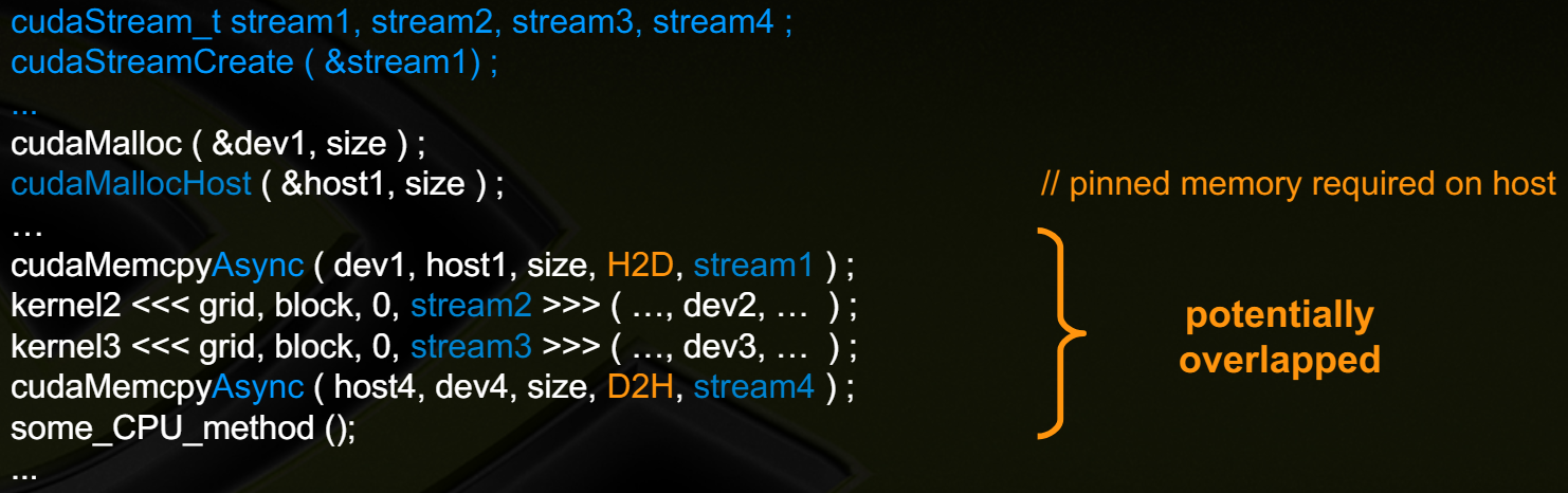 다만, 동시에 수행하기 위해서는 CUDA 동작들은 서로 다른 Stream안에 존재해야하며, 'cudaMemcpyAsync'의 경우 'pinned' memory에 할당된 영역을 접근할 때 가능하다.