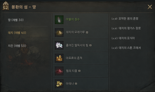 몽환의 섬 - 땅 : 땅 (레벨 30), 대지 (레벨 40), 지진 (레벨 50)